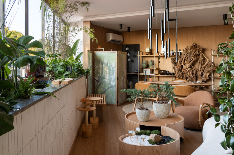 Inspirado nos amuletos japoneses que simbolizam sorte e proteção, o ambiente foi concebido como um refúgio para corpo e alma, promovendo bem-estar, autoconhecimento e inspiração aos visitantes. Para traduzir esse conceito, Rose explorou elementos de conexão com a natureza, como a madeira e o bambu, um espelho d’água e vasos esculpidos em pedra. As cores quentes reforçam a sensação de acolhimento, enquanto o sofá orgânico convida à contemplação do céu.