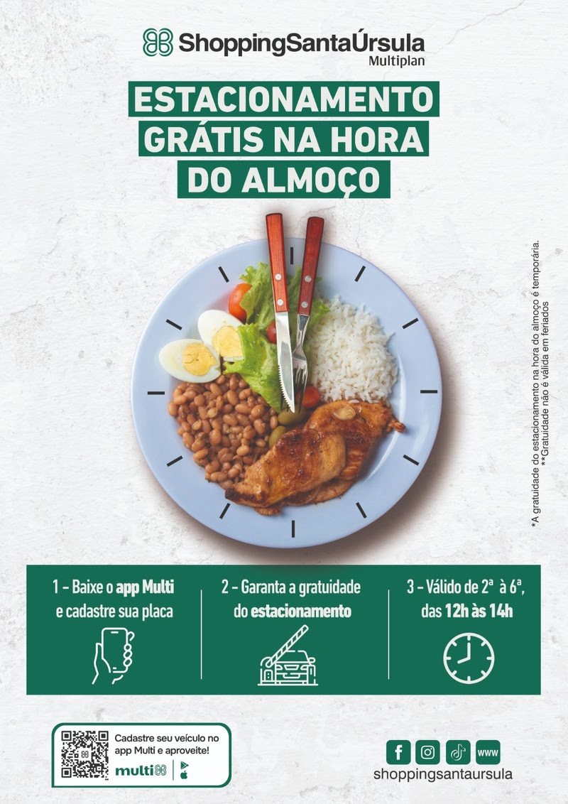 A partir de 5 de janeiro de 2026, o ShoppingSantaÚrsula oferece mais um diferencial aos seus clientes: estacionamento gratuito, de segunda a sexta-feira, no período das 12h às 14h. Para garantir o benefício, basta cadastrar a placa do veículo no app Multi.